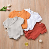 Summer tie-up romper, with easy to use clasp buttons. Coming in four different colours, it's a must have little summer outfit.