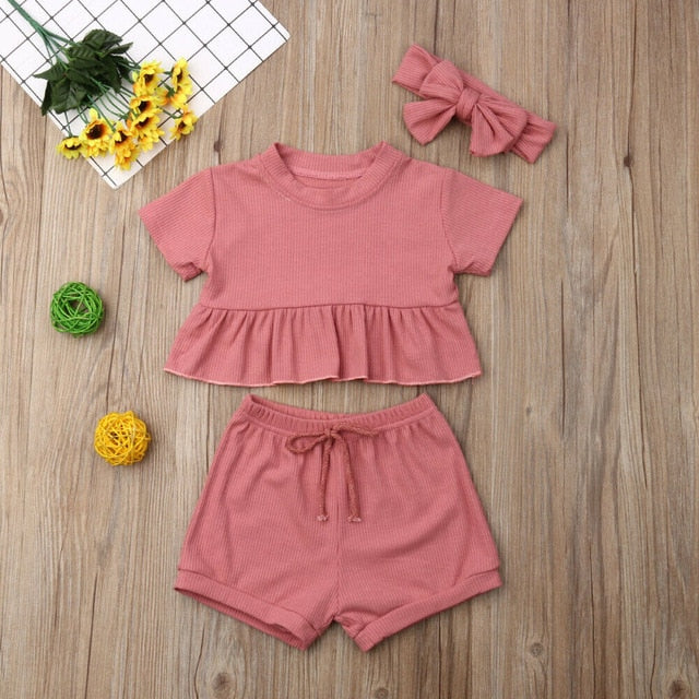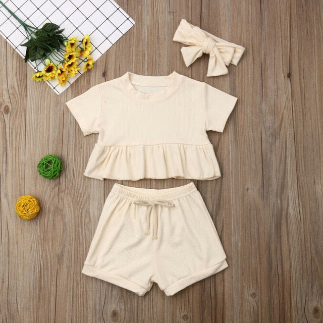 Summer baby & toddler top, short & headband set with breathable ribbed cotton perfect for your little one. With easy to wear stretch waist for comfortable wearing.