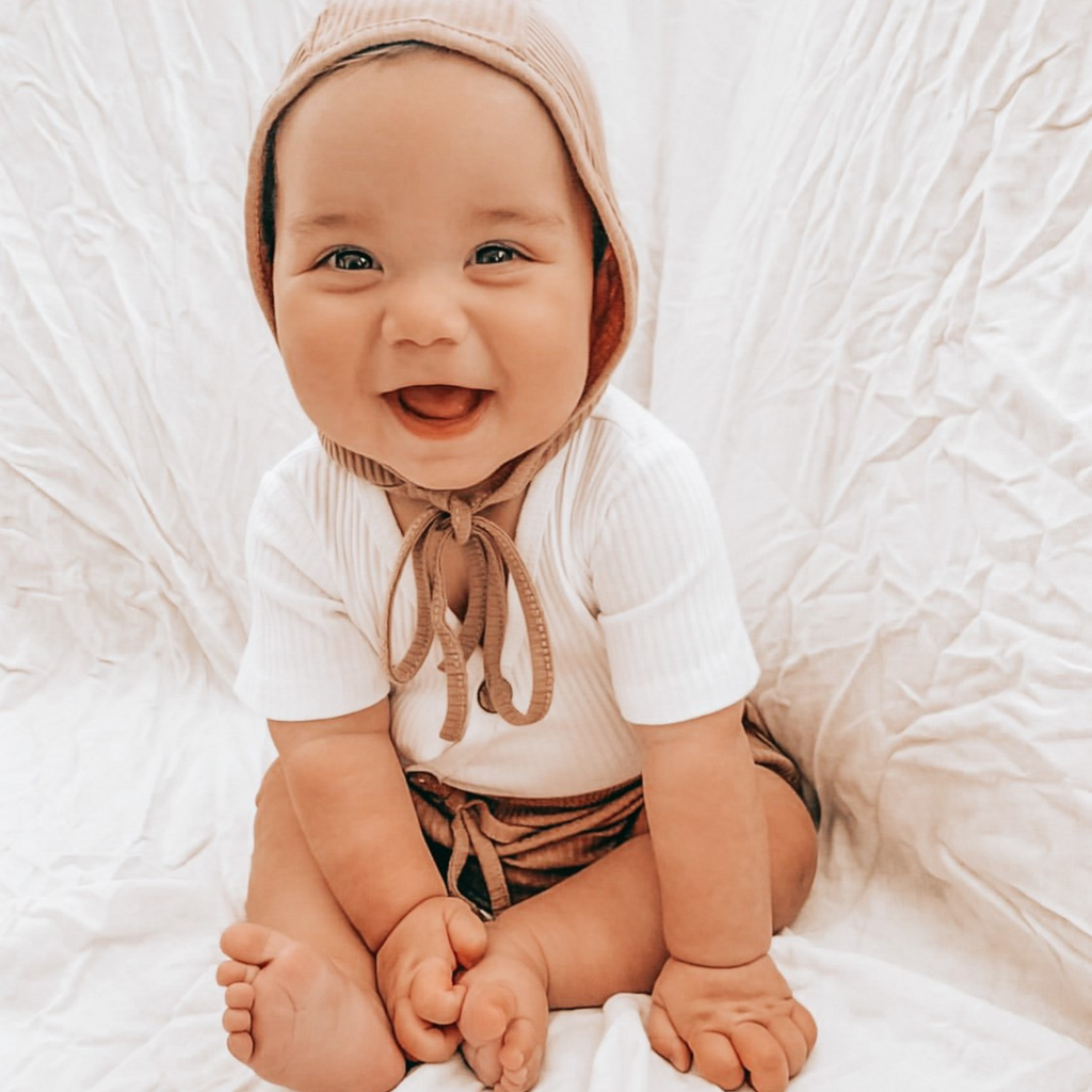 Baby & toddler onesie, bloomer & bonnet set with breathable cotton perfect for your little one. With easy to wear stretch waist for comfortable wearing.