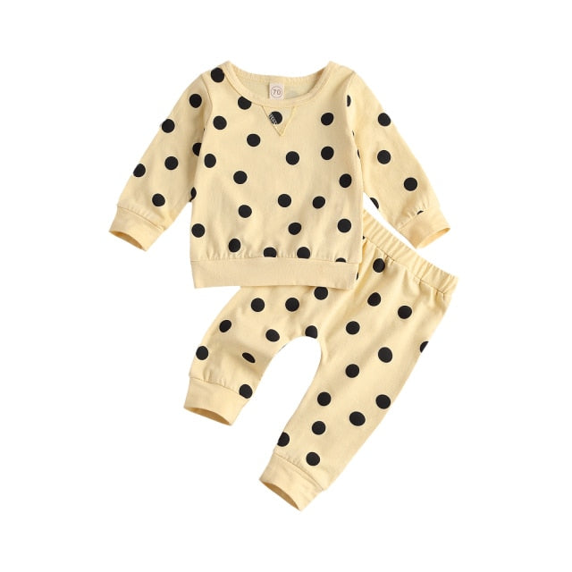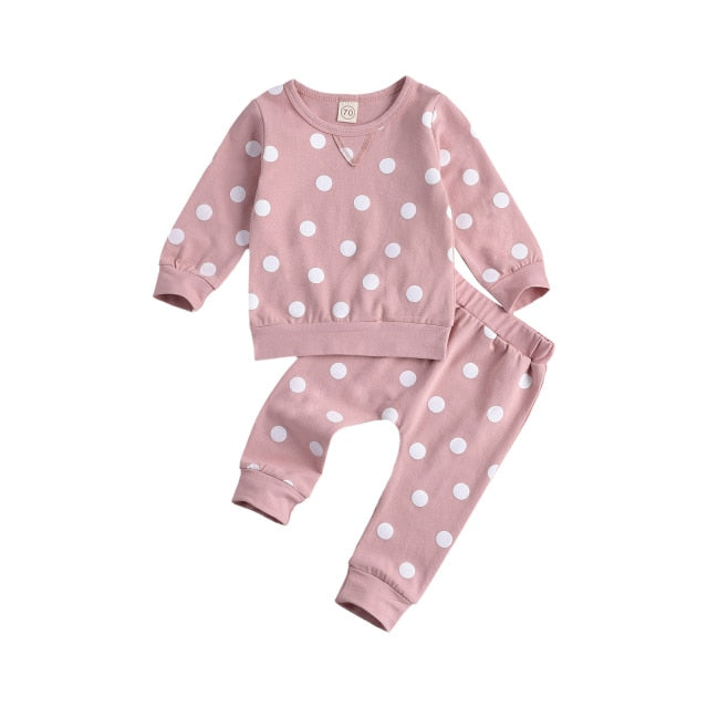 Polka dot baby & toddler long sleeve top and track-pants set with breathable cotton perfect for your little one. With easy to wear stretch waist for comfortable wearing.