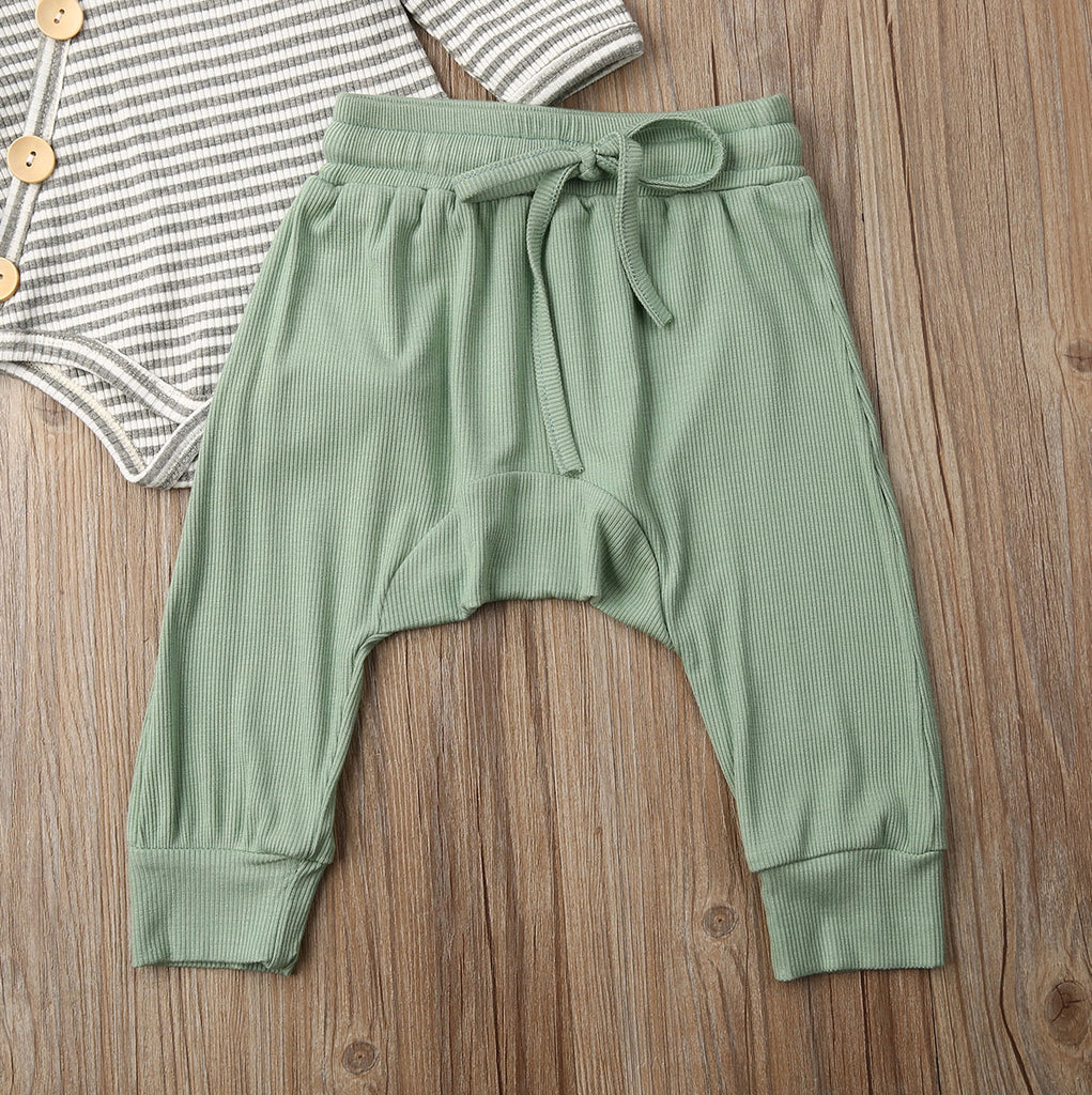 Baby & toddler romper and track-pants set with breathable cotton perfect for your little one. With easy to wear stretch waist for comfortable wearing.